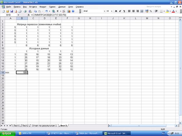Рабочий лист EXCEL, содержащий результаты решения, имеет вид: