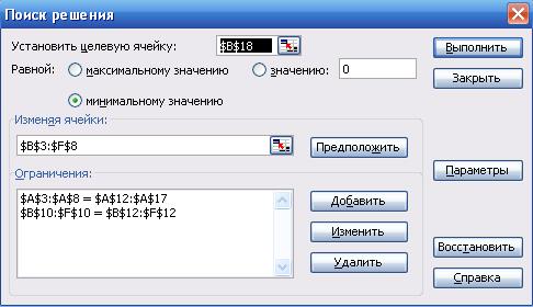 После ввода исходных данных запускается надстройка «Поиск решения» (меню «Сервис» ® «Поиск решения…») и добавляются новые ограничения в панели надстройки: