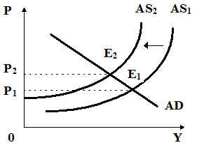 Рисунок 2. Инфляция предложения. Шоковое сокращение совокупного предложения (AS1 ® AS2) приводит к росту уровня цен (P1 ® P2) в национальной экономике.
