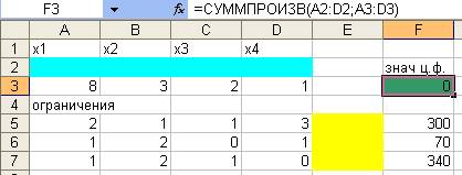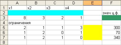 2. Указать адреса ячеек, в которые будет помещен результат решения (изменяемые ячейки). Обозначить для х1, х2, х3, х4 количество ресурсов каждого типа. Оптимальные значения компонент вектора Х=(х1, х2, х3, х4) будут помещены в ячейках А3:Д3оптимальное значение целевой функции в ячейке F3. Ввести исходные данные задачи в созданную форму-таблицу: