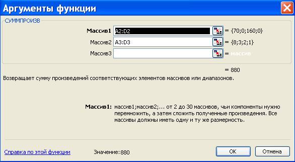 - нажать кнопку ОК. На экране появляется диалоговое окно СУММПРОИЗВ: