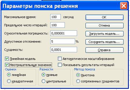 - установить флажки в окнах Линейная модель и Неотрицательные значения