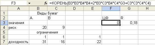 Имеется портфель ценных бумаг, состоящий из двух бумаг А и В, при этом и бумага А и бумага В обладают собственной доходностью (m) и собственным риском (σ). Так же дан коэффициент корреляции R=0,18, который предполагает, что не такое количество рыночных факторов влияет на бумагу А активно влияют на бумагу В. Необходимо минимизировать риск, достигнув при этом обязательной доходности.