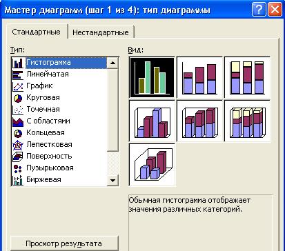 · Выбрать тип диаграммы: график; выбрать вид: первый (шаг 1);