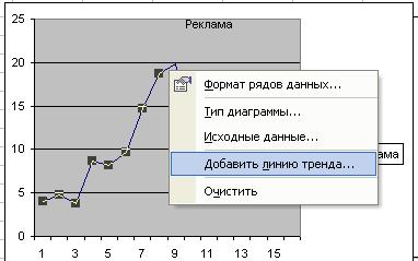 · Щелкнуть правой кнопкой мыши на линии полученного графика. График выделен метками. Выбрать Добавить линию тренда.