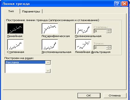 · Выбрать тип Линейная в появившемся диалоговом окне Линия Тренда (потом Логарифмическая и Полиномиальная третьей степени).