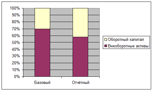 Как видно из таблицы в отчетном периоде увеличилась доля оборотного капитала, что положительно характеризует предприятие. На основании таблицы 8 мы построили график доли активных производственных фондов.