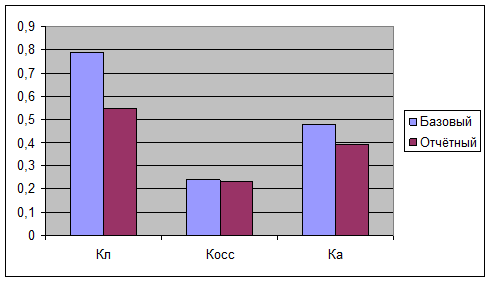 Как видно из графика в отчётном периоде, по сравнению с базовым периодом все коэффициенты, характеризующие финансовое состояние предприятия снизились.