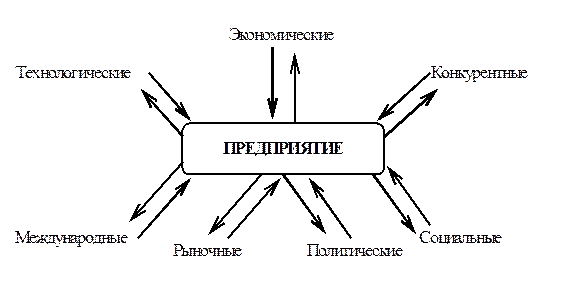Любая предпринимательская несвободна от действия внешних факторов, влияние которых нельзя не учитывать. В самом общем (схематичном) виде влияние внешних факторов на предприятие, осуществляющее коммерческую деятельность, изображено на рис. 1.