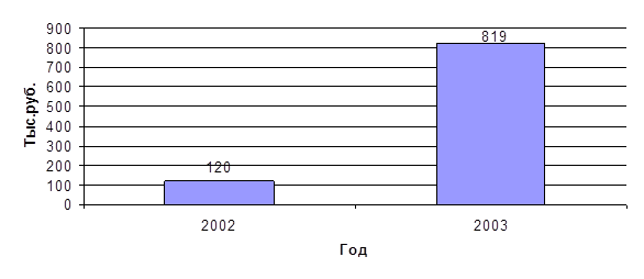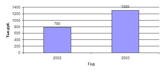 С 2002 г. по 2003 г. произошло увеличение выручки от реализации товаров на 520 тыс. руб., в это же время произошло снижение себестоимости проданных товаров на 179 тыс.руб. Это произошло из-за увеличения объема продаж и снижения постоянных издержек на изготовление продукции.