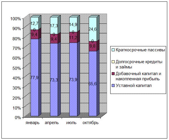- на 01.10.97 доля уставного капитала падает до 65,6 %. Доля добавочного капитала падет до 9,8 %. При этом резко возрастает доля краткосрочных пассивов с 14,9 до 24,6 %.