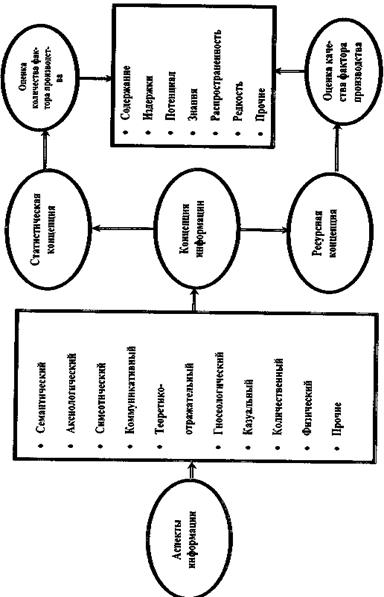По современным воззрениям информация может быть представлена в следующих аспектах (рис. 3): семантическом, отражающем смысловое содержание или значение информации; аксиологическом, отражающем ценность информации для самоуправляемой системы; семиотическом, где рассматриваются способы отражения конкретной информации в определенной знаковой системе; коммуникативном, отражающем информационные связи в системе; теоретико-отражательном, рассматривающем роль информации в процессах отображения; гносеологическом (теоретико-познавательном), представляющем информацию как средство познания; казуальном, отражающем роль информации в причинно-следственных отношениях; количественном, как форме измерения информации; физическом, как материальном воплощении информации и др.