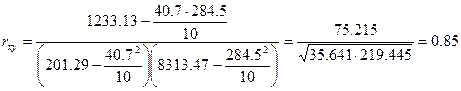 По таблице критических точек распределения Стьюдента, по заданному уровню значимости α=0,05 и числу степеней свободы k=n-2 , находим критическую точку tк=2,23. Так как tr> tк , то величина коэффициента корреляции признается существенной. Следовательно, X и Y коррелированны и связь между ними средняя.