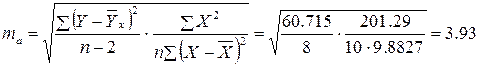 Анализ верхней и нижней границ доверительных интервалов приводит к выводу о том, что с вероятностью p= 1 - α =0.95 параметры . a и b, находясь в указанных границах, не принимают нулевых значений, т.е. не являются статистически незначимыми и существенно отличны от нуля.