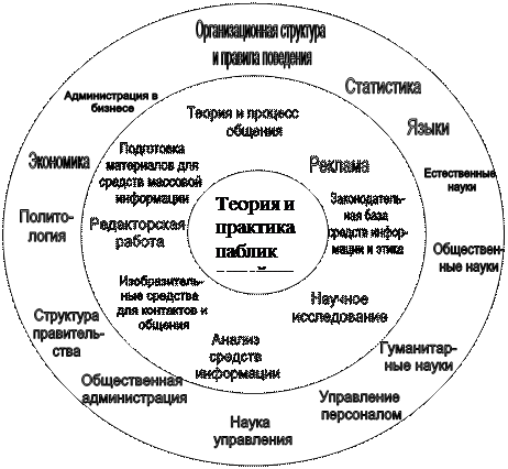 В самую малую, центральную окружность включены предметы, имеющие особое значение для практики в области ПР .Во втором по величине круге – предметы, связанные со сферой человеческого общения. В третьем и самом большом круге представлены предметы общего и гуманитарного характера, имеющие большое значение при подготовке высококлассного профессионала.
