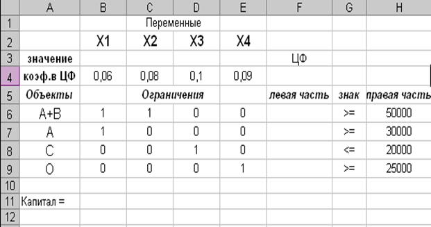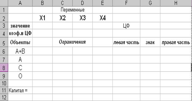 1. Создать форму для ввода условий задачи. Запустите Excel, выбрав Microsoft Excel из подменю Программы главного меню Windows. Открывается чистый лист Excel. Создается текстовая форма – таблица для ввода условий задачи (рис. 1.1.)