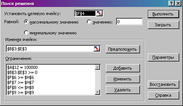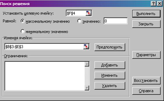 ) будут помещены в ячейках В3:Е3, оптимальное значение