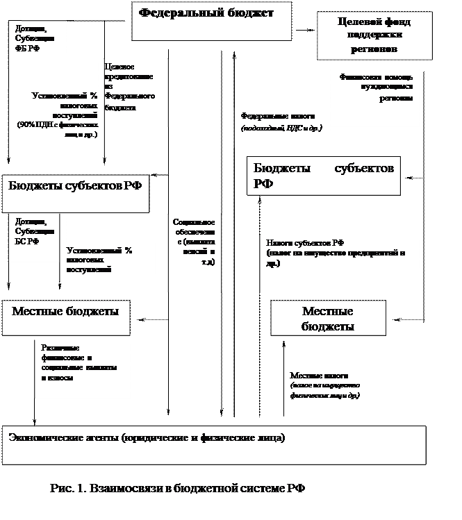 Бюджетное устройство нашей страны обеспечивает непрерывную взаимосвязь бюджетов всех уровней (федеративный, субъектов Федерации и местных). (см. Рис.1)