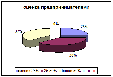Особенность малого бизнеса — его высокая теневая составляющая, что не может не влиять на поведение предпринимателей. Некоторые теневые стороны их деятельности институционализировались и стали составной частью повседневности, молчаливо принимаемой как реальность. Поэтому сокрытие налогов и доходов - это реакция на ненормативные отношения бизнеса и власти. Как малые предприятия отражают свои доходы в официальной отчетности - показано на рис.2. Средневзвешенное их значение, по оценкам предпринимателей и государственных служащих, составляет, соответственно, 40,4 и 36,5%. Следовательно, реальные доходы предпринимателей превышают официальные в 2,5-2,7 раза.