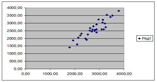 Исследуемая совокупность исходных данных содержит значения признаков которые резко выделяются из основной массы значений, которые били обнаружены после построения точечного графика рассеяния значений показателей. Эти значения (предприятие №30, Среднегодовая стоимость основных производственных фондов равная 3790,00 и Выпуск продукции равный 1000,00; предприятие №11, Среднегодовая стоимость основных производственных фондов равная 1190,00 и Выпуск продукции равный 3000,00 ) следует исключить из исходных данных вследствие их не типичности для изучаемой выборки.