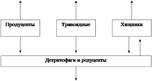 Существует еще одна группа организмов, называемых редуцентами. Это сапрофиты (обычно, бактерии и грибы), питающиеся органическими остатками мёртвых растений и животных (детритом). Детритом могут также питаться животные – детритофаги, ускоряя процесс разложения остатков. Детритофагов, в свою очередь, могут поедать хищники. В отличие от пастбищных пищевых цепей, начинающихся с первичных продуцентов (то есть с живого органического вещества), детритные пищевые цепи начинаются с детрита (то есть с мёртвой органики).