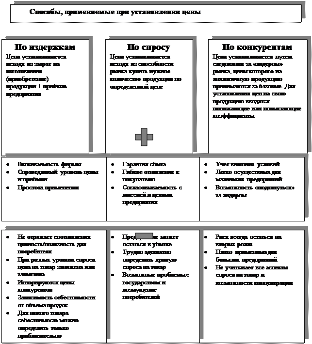 Спрос, как правило, определяет максимальную цену, которую предприятие может запросить за свой товар, а минимальная цена определяется издержками производства. Предприниматели назначают такие цены за товар, чтобы они полностью покрывали издержки производства, затраты на распределение и сбыт, включая норму прибыли за риск.