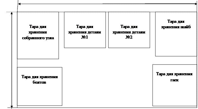 2. Предложить схему планировки рабочего места, отразив на ней размещение необходимой организационной оснастки (тары для хранения отдельных деталей и собранного узла) и указав расстояние от рабочего с учетом рекомендаций относительно рациональных зон досягаемости рук рабочего.