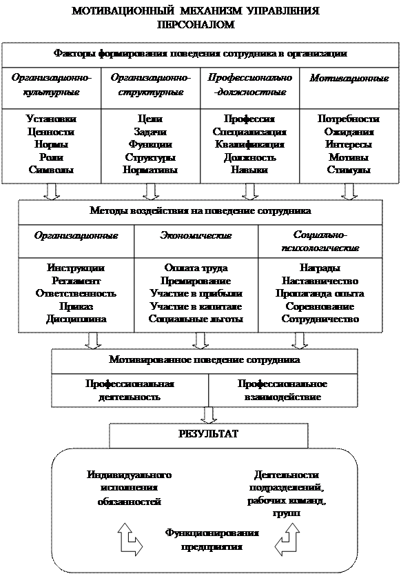 Мотивационный механизм управления персоналом призван создать условия достижения целей фирмы, формируя и закрепляя с помощью сочетания разнообразных методов воздействия необходимое для организации поведение сотрудников, отличительными чертами которого является ответственная исполнительность и творческая инициативность. «Выбор конкретных мер и средств управления персоналом обусловлен оценкой силы их мотивационного воздействия на поведение сотрудников и предполагает гибкое сочетание организационных, экономических и социально-психологических методов управления»[19].