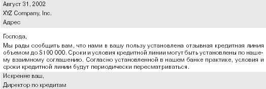 2. Кредитная линия. Это отзываемый кредит, при котором заемщик извещается, что средства в определенном размере на взаимно согласованный срок будут ему предоставляться на взаимно согласованных условиях, которые подлежат периодическому пересмотру. Отзыв кредитной линии случается редко, обычно — при явных серьезных отклонениях от условий соглашения. В качестве примера извещения об открытии кредитной линии см. таблицу 4.1.