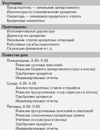 Вернемся к нашему вымышленному банку. Департамент коммерческих кредитов проводит совещания три раза в неделю. Совещание является одновременно внутренним кредитным комитетом, на котором одобряются кредиты, превышающие индивидуальные лимиты инспекторов. Впрочем, на совещаниях есть что обсудить и помимо кредитов (см., например, повестку совещания в таблице 4.3).