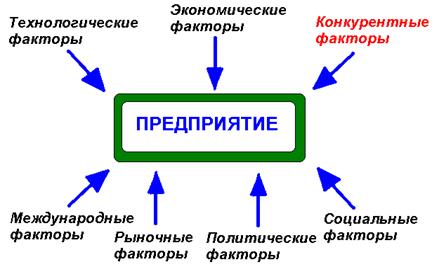 Среди рассмотренных выше факторов внешней среды конкурентные факторы занимают особое место. Ни одна организация не может себе позволить игнорировать фактические или возможные реакции своих конкурентов. Суть анализ этого фактора коротко можно сформулировать следующим образом: