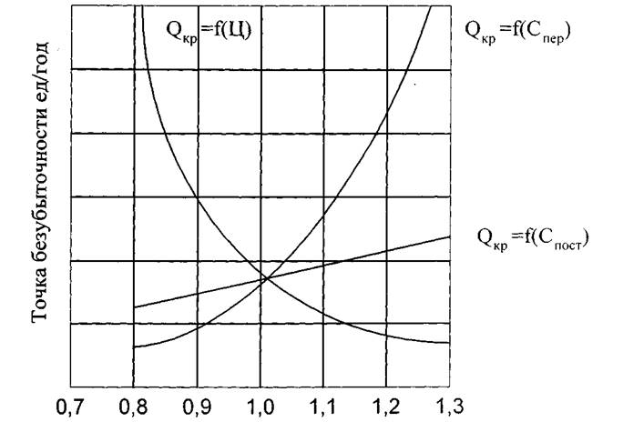 Рис.9. Зависимость точки безубыточности от изменения цены, переменных и постоянных затрат