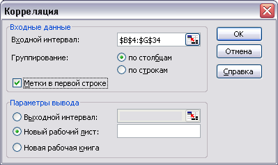1. С помощью надстройки «Анализ данных… Корреляция» строим матрицу парных коэффициентов корреляции между всеми исследуемыми переменными (меню «Сервис» ® «Анализ данных…» ® «Корреляция»). На рис. 1 изображена панель корреляционного анализа с заполненными полями[1]. Результаты корреляционного анализа приведены в прил. 2 и перенесены в табл. 1.