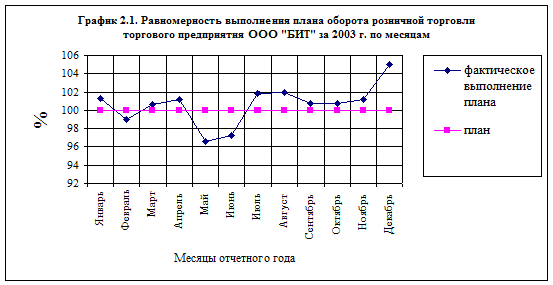 Коэффициент ритмичности определяют отношением числа периодов, за которые выполнен план, к общему их количеству. Торговым предприятием ООО «БИТ» план объема продаж выполнен в девяти из двенадцати месяцев, как видно из графика 2.1. Отсюда коэффициент ритмичности равен 0,75 (9:12), или ритмичным его выполнение было только на 75,0 %. (см. табл. 2.2 и график 2.1.)