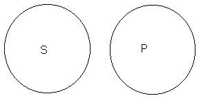 Суждения Е. Возьмём обще-отрицательное суждение «Незаконный договор является недействительным. В этом суждении мы отрицаем всякое совпадение между подлежащим и сказуемым; один класс находится вне другого класса. Мы в мышлении совершенно отделяем класс подлежащего от класса сказуемого. Символически отношение S к Р в таких суждениях может быть обозначено посредством двух отдельно стоящих и не связанных друг с другом кругов.