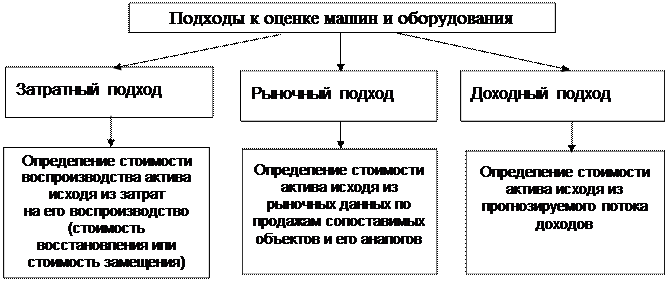 В первом случае оценка идет «россыпью», во втором - «потоком», а в третьем имеет место системная оценка. При оценке машин и оборудования важным является правильность выбора методов оценки. Эти методы опираются на три подхода: затратный, сравнительный (рыночный), доходный (рис. 1)