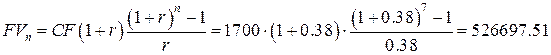 Определить будущую стоимость обыкновенного аннуитета накопления с реальной доходностью 20 процентов в год с учетом инфляции (ежегодный темп инфляции составляет 15 процентов), если ежегодный вклад пренумерандо 1700 (у.д.е.), а срок операции 7 лет.
