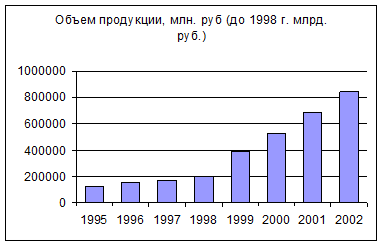 Таким образом, за период 1995-2002 гг. можно увидеть некоторое увеличение выпуска продукции пищевой промышленности (кроме мясной продукции), однако если сравнивать объемы производства с 1990 г., то можно заметить стойкое снижение выпуска продукции по всем видам в разы.