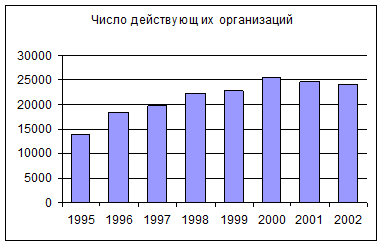 Основные показатели работы пищевой промышленности представлены в табл. 2. (см. Приложение). Анализируя основные показатели работы пищевой промышленности за 1995-2002 гг., можно отметить увеличение объема продукции (рис. 2), увеличение числа действующих организаций (в 2002 г. по отношению к 1995 их число увеличилось почти в 2 раза) (рис. 3). Численность персонала практически не изменилась (рис. 4), уровень рентабельности продукции несколько снизился и составил в 2002 г. 10,6% против 16,3% в 1995 г (рис. 5).