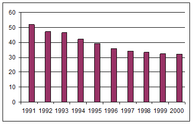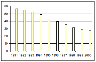 В пищевой отрасли промышленности уже давно хозяйничает иностранный капитал. На него приходится до 60% всех прямых иностранных инвестиций в экономику России, а часть рынка вообще захвачена западными гигантами, наподобие Coca-Cola и PepsiCo, на двоих освоивших в Российской Федерации более 1,3 млрд. долларов продукции[5]. Здесь вложения быстро окупаются (инвестиционный цикл в 1,5 раза короче) и иностранцам это хорошо известно. Отечественный (а практически полуиностранный) пищепром прирастает к появившимся на отечественном рынке десяткам тысяч российских и западных компаний, создавших достаточное изобилие продовольственных товаров. Другое дело, что они не по карману не только большинству людей, но и целые слои населения недоедают и постепенно вымирают. По последним данным главного санитарного врача Росиийской Федерации, суточная ценность питания упала в среднем за 10 лет реформ с 3359 ккал до 2200. Но это усредненные данные.