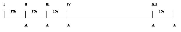 б) На рисунке прямая разбита на 12 отрезков, соответствующих месяцам года, по условиям задачи владельцы дома каждый месяц вносят определенную сумму (A), (предполагаем, что сумма вносится в конце месяца – обычный аннуитет) и на эту сумму каждый месяц начисляется 1% (12% / 12 месяцев).