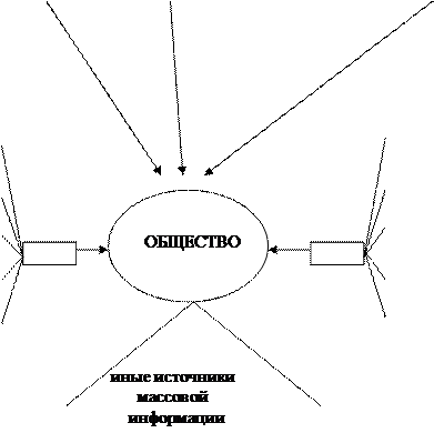 Таким образом, в процессе дифференциации, при формировании всего разнообразия изданий и программ, складывается большая совокупность СМИ. Аудитории предстоит выбрать некоторые из них в соответствии с запросами и интересами и независимо от того, сознают эти журналисты или нет, между СМИ возникают отношения как между всеми сразу, так и между теми, к которым обращаются тот или иной слой аудитории. Схематически это можно представить следующим образом.