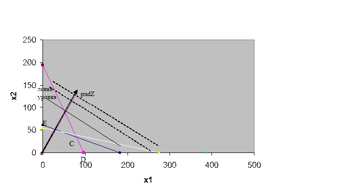 Вектор, компоненты которого являются коэффициентами целевой функции при переменных х1 и х2, называют вектором – градиентом целевой функции и обозначают grad Z.