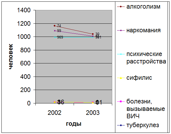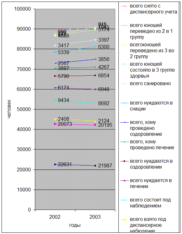 - в 2003 году произошло снижение общего количества допризывников, состоящих на учете в диспансере с 9434 до 8692 человек;
