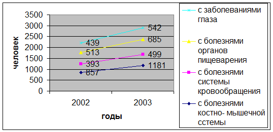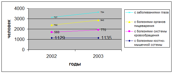 Из рисунка 4 заметны тенденции роста численности прошедших лечение допризывников в 2003 году по заболеваниям костно-мышечной системы с 1129 до 1135 человек, системы кровообращения с 560 до 770 человек, органов пищеварения с 702 до 943 человек, глаза с 737 до 542 человек.