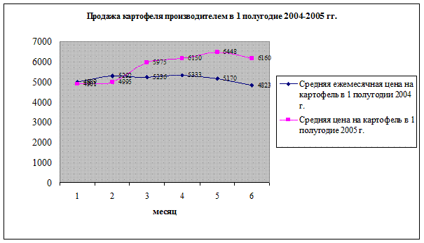 Рис.8 Диаграмма средней цены производителя на картофель в 1 полугодие 2004-2005 гг.