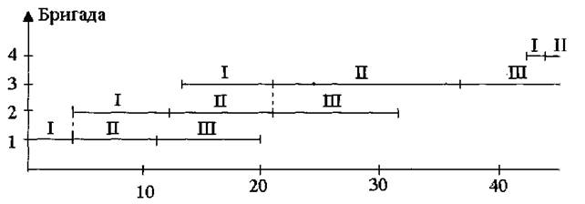 3. Для оптимального варианта изобразить линейный график и циклограмму движения специализированных бригад по участкам.