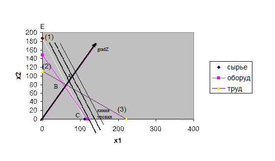 На рисунке видно, что оптимальное решение соответствует точке В, лежащей на пересечении прямых (1) и (2). Поэтому ее координаты находим как решение системы линейных уравнений, задающих эти прямые: