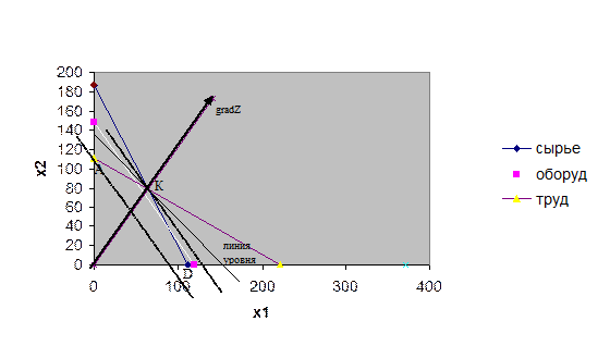 Вектор, компоненты которого являются коэффициентами целевой функции при переменных х1 и х2, называют вектором – градиентом целевой функции и обозначают grad Z.