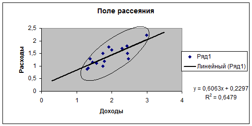 2. ŷ = 0,2297 + 0,6063х – уравнение регрессии, количественно выражающее зависимость расходов от доходов.